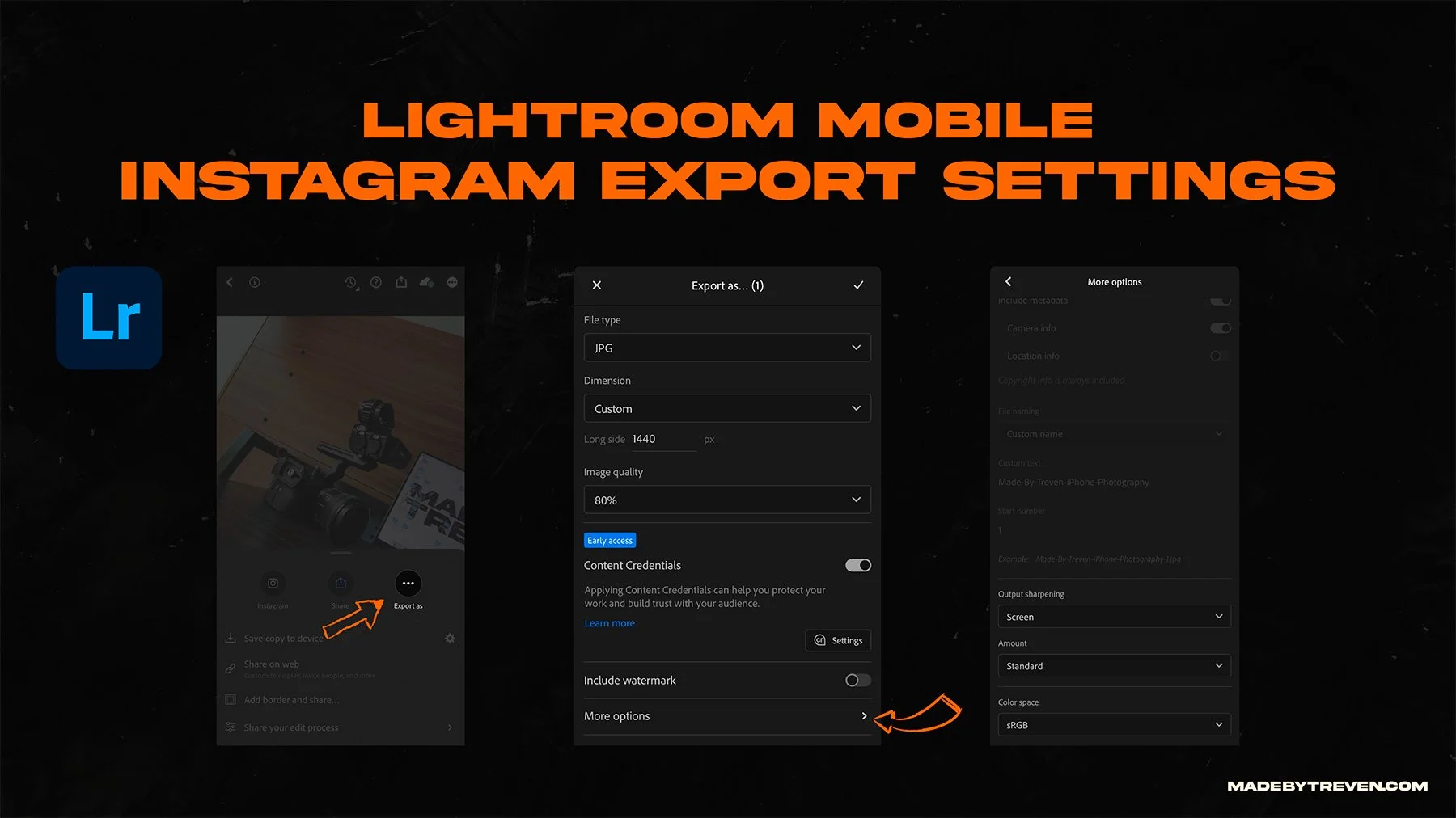 Lightroom Mobile export path: Share → Export As → JPG. Set long edge to 1440 for vertical posts, quality to 80–85, Output Sharpening to Screen Standard, and color space to sRGB. Tap More options to reveal sharpening and color settings.